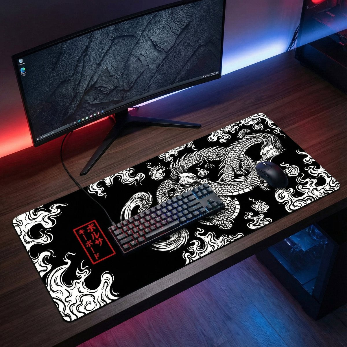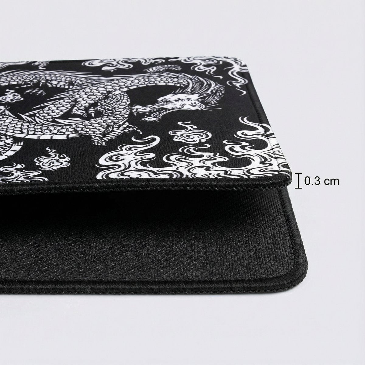De Dragon Art muismat toont een krachtig Japans draak artwork in zwart-wit in inktstijl en geeft je bureau een stoere en artistieke uitstraling. Het ontwerp is geïnspireerd op traditionele Japanse kunst en past goed in een moderne, minimalistische of creatieve werkplek.