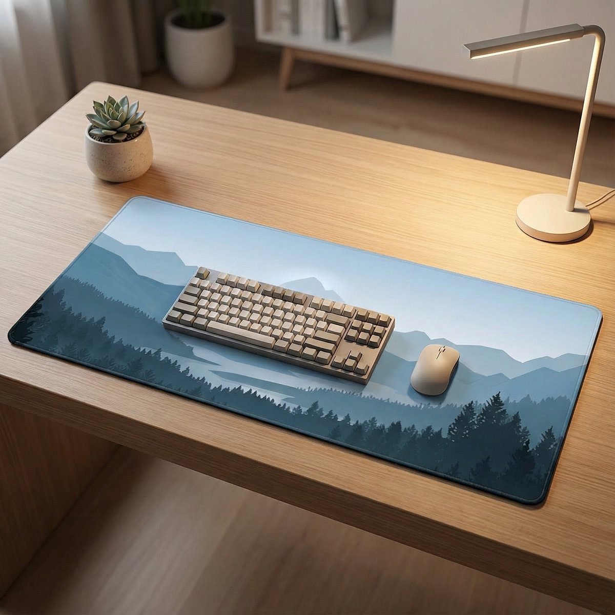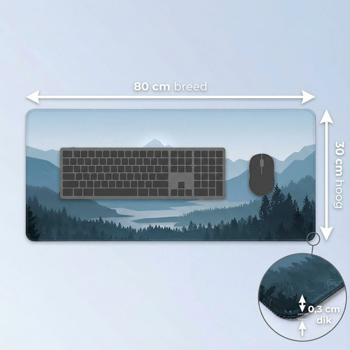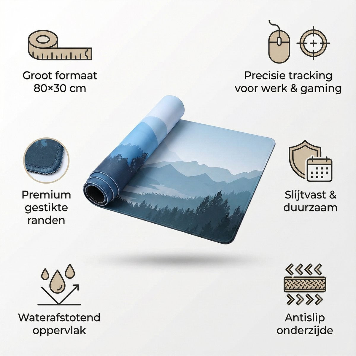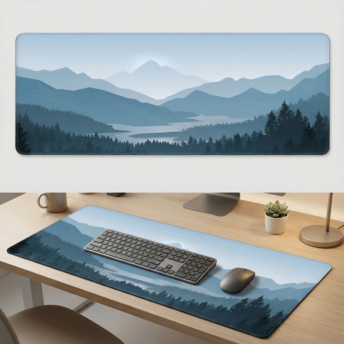 De Berg landschap muismat toont een rustgevend berglandschap in blauwe tinten en geeft je bureau een kalme, natuurlijke uitstraling. Het design past goed in een moderne, minimalistische of rustige werk- en gamingomgeving.