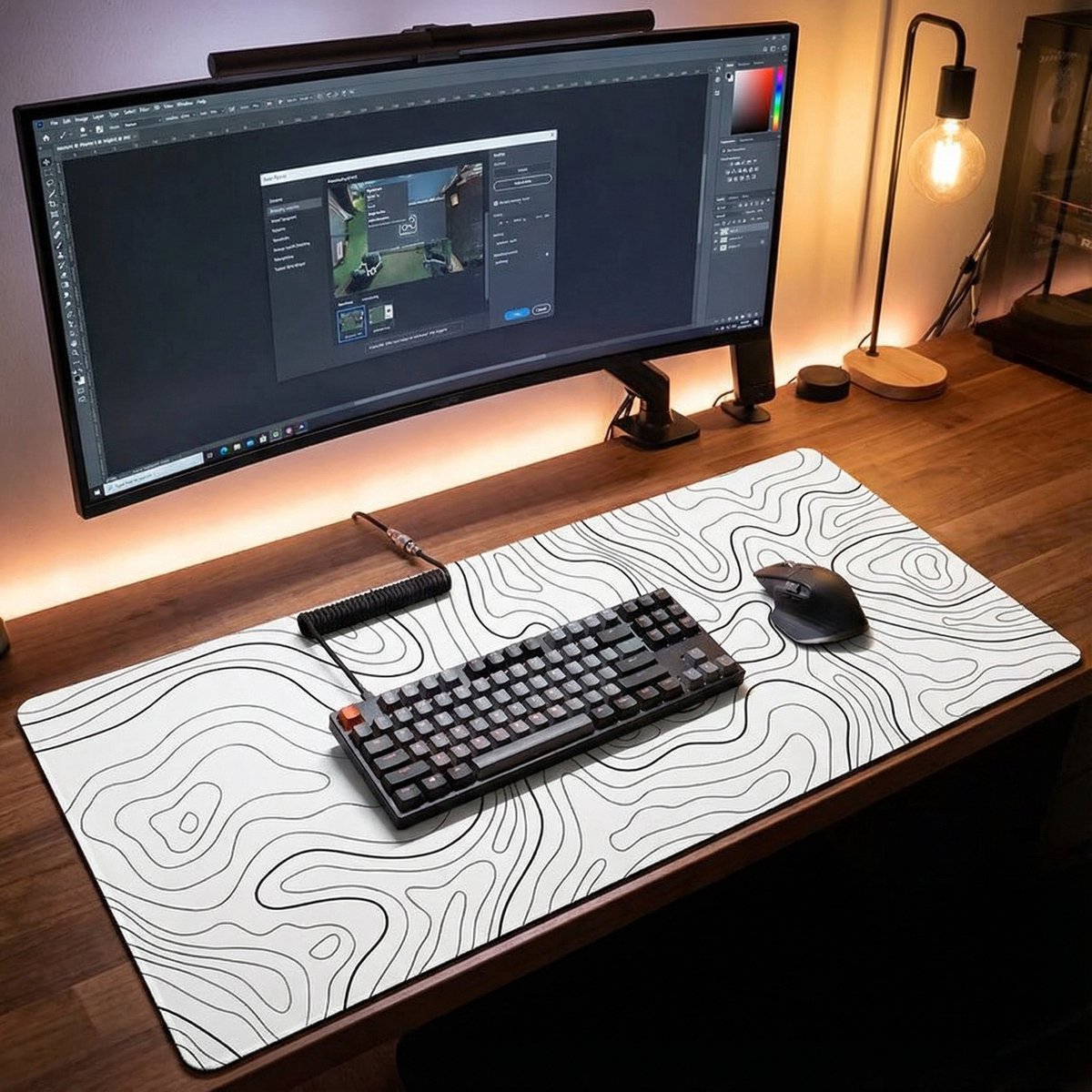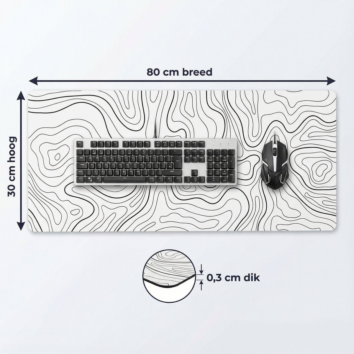De White Topographic muismat heeft een strak wit topografisch patroon en geeft je bureau een rustige en minimalistische uitstraling. Het subtiele design past perfect in een moderne werkplek of een clean gaming bureau.