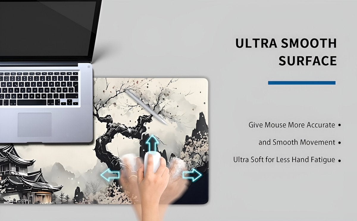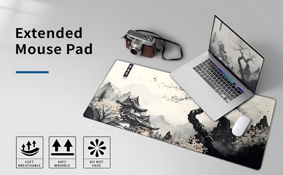 De Design muismat heeft een Japans landschap design met een rustige en minimalistische uitstraling. Het ontwerp brengt balans en sfeer naar je bureau en past goed in een moderne werk of gamingomgeving.